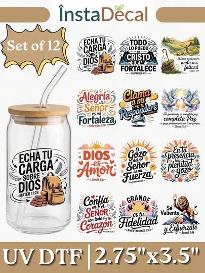 12张西班牙语圣经经文UV DTF贴纸(2.75x3.5英寸),基督教狮子牧羊人语录贴纸,适用于咖啡杯、陶瓷杯、笔记本电脑,DIY宗教礼物