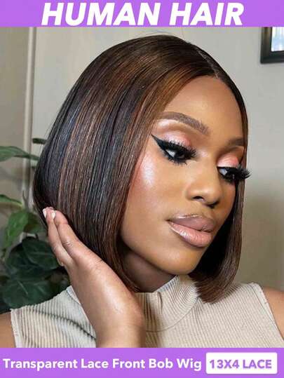 13x4蕾丝前波波头假发 - 可随意分缝,透明预拔毛带婴儿发,150%密度直发真人发假发,自然外观,女士自然黑色短波波头假发,8、10、12、14、16英寸(自然黑#1B、#1B30、#4/30)挑染波波头假发 - 彩色 - 查看 1