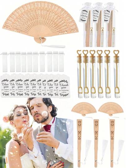 15/5件套婚礼礼品套装。木质婚礼扇、金色心形泡泡瓶(带感谢标签流苏)、优雅婚礼礼物、木质扇子和雪纺袋、婚礼回礼,适合婚礼礼物、派对、新娘送礼会等场合。 - 彩色 - 查看 1