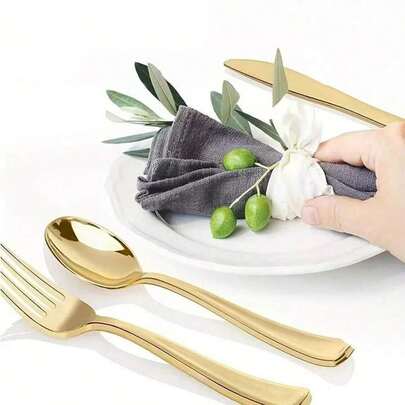 150/100/50/30/25/10/5件套镀金刀叉勺,适用于蛋糕、沙拉、西餐、意面,可作咖啡搅拌棒,可重复使用且可清洗,是派对、户外活动、家庭聚会、婚礼、生日、节日、万圣节、圣诞节礼物和厨房用品的理想之选。易于清洁且可重复使用!经久耐用的餐具——完美的派对用品。 - 金色 - 查看 10