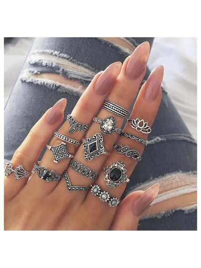15 件套水钻装饰星星、太阳、月亮、蝴蝶、字母设计戒指 - 復古銀色 - 查看 1