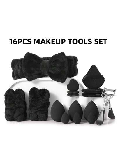 16件套化妆工具套装,包括:1个发带+2个手碗带+3个三角粉扑+3个化妆海绵+3个迷你化妆海绵+3个迷你气垫粉扑+1个睫毛夹