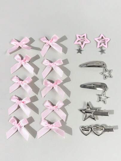 16件套女士时尚简约街头风可爱少女粉色银色星星、爱心、蝴蝶结、鸭嘴夹、BB夹配饰套装,适合日常穿搭、节日、派对、旅行、拍照及任何场合。