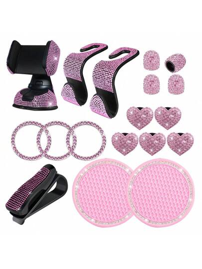 18入組粉色的水鑽車配件套裝,包括水鑽方向盤套,汽車內飾裝飾 - 粉色 - 查看 10