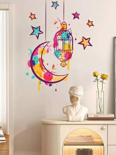 1PC 斋月装饰贴纸,星月吊灯图案,PVC装饰贴纸,可移除墙贴,家居节日装饰贴纸。 - 彩色 - 查看 1