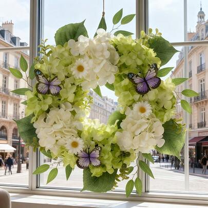 1个绣球花蝴蝶仿真花环,直径52厘米,绿白相间的花卉设计,点缀着3D蝴蝶,非常适合装饰前门、墙面和春季派对,春夏季节皆宜。 - 彩色 - 查看 10
