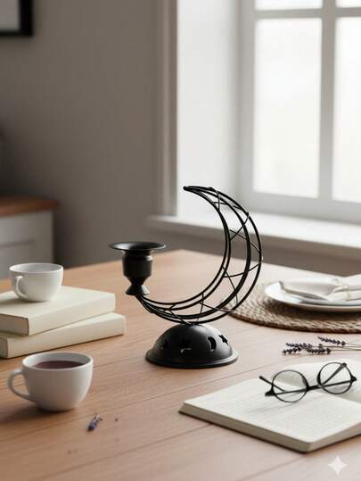 一套/件,层叠弧形星月金属烛台。这款烛台采用金属丝和金属底座制成,设计简约。其造型为新月形框架,由多个交织的弧线构成,搭配饰有星月镂空图案的圆顶底座和杯状烛托。 - 彩色 - 查看 13