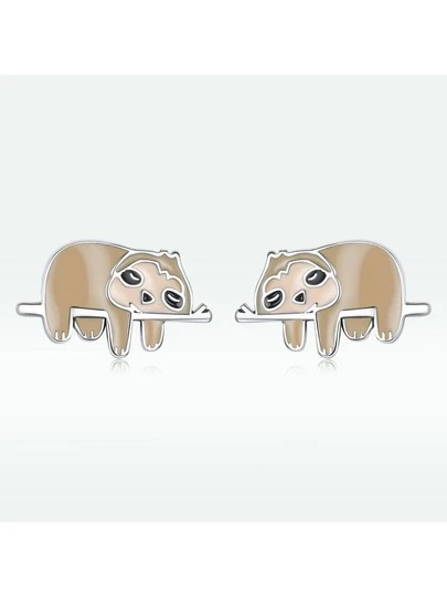 1對琺瑯卡通耳環925純銀可愛小樹懶耳釘適合女士女孩精細首飾類動物禮品 - 銀色 - 查看 1