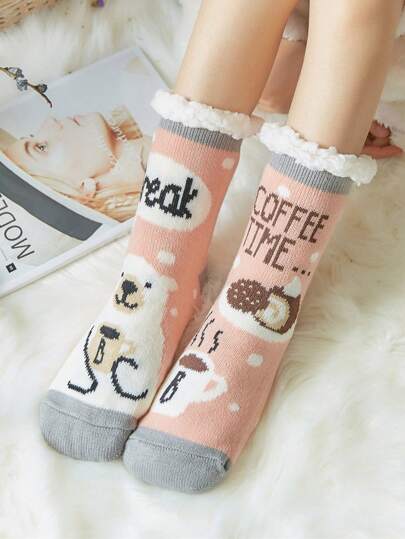 1 雙冬季雪花圖案防滑家居地毯襪 - 粉色 - 查看 6