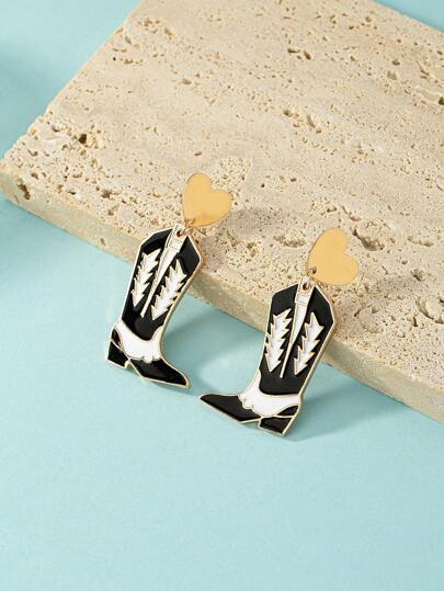 1 对 Y2k 波西米亚风格合金几何心形和牛仔靴形吊坠耳环,带彩色图案,适合女性,适合日常佩戴、度假、旅行、交友或情人节礼物 - 黑與白 - 查看 1