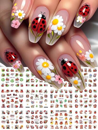 6. 1张12款卡通可爱花朵瓢虫美甲贴纸,夏季昆虫雏菊花瓣叶子蘑菇水转印美甲贴花水印美甲装饰美甲用品,适合女性及节日礼物