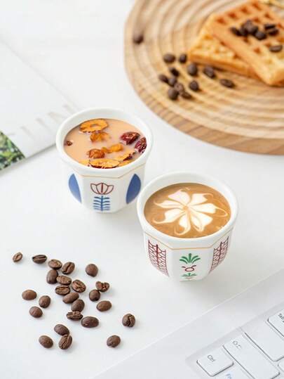 1个100毫升郁金香/棕榈树图案陶瓷咖啡杯 - 也可作酸奶/巧克力碗使用,适合日常使用、聚会、招待客人和下午茶。复古餐具,适合家庭和餐厅使用,或作为礼物送给朋友、家人或学校。 - 彩色 - 查看 1