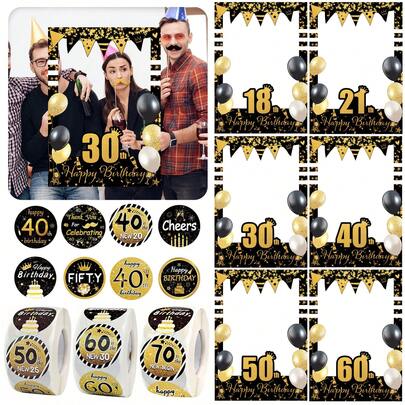 1件/1套黑色金色生日快乐贴纸相框拍照道具,适用于18 21 30 40 50 60岁生日派对DIY拍照装饰用品 - 彩色 - 查看 1