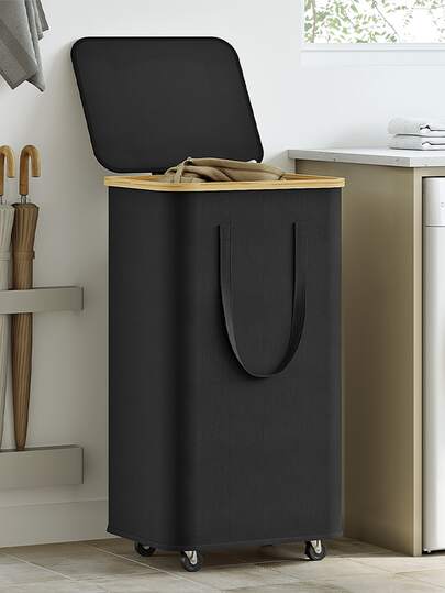 1个60升/100升带轮竹制洗衣篮,带盖 - 含洗衣袋内衬,可折叠脏衣篮,超大容量洗衣篮,可折叠布艺洗衣篮,家用洗衣篮