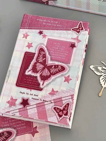 1本A7复古牛仔布蝴蝶笔记本 - 80页,韩式蝴蝶空白日记本,牛仔布封面笔记本,日记本,计划本,蝴蝶图案,适合写日记、剪贴簿、记事本、日记艺术收藏、剪贴簿