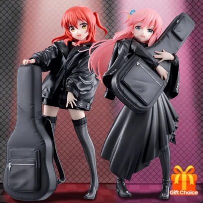 1个动漫摇滚女孩角色收藏手办 - 可爱风格PVC雕像,身穿黑色夹克,红/粉色头发,摆出动感姿势,配有吉他造型配件 - 粉丝展示手办 - 彩色 - 查看 1