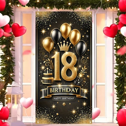 1件生日门帘,背景设计为金色亮片蛋糕和“18岁生日快乐”字样,高清印花涤纶面料,适用于生日派对、庭院、入口门和摄影用品。 - 彩色 - 查看 6