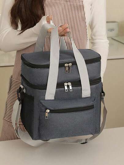 1pc黑色,灰色,酒红色,藏青色加厚新款双层饭盒袋保温袋户外野餐保鲜斜挎冰袋多功能防水午餐包 - 彩色 - 查看 1