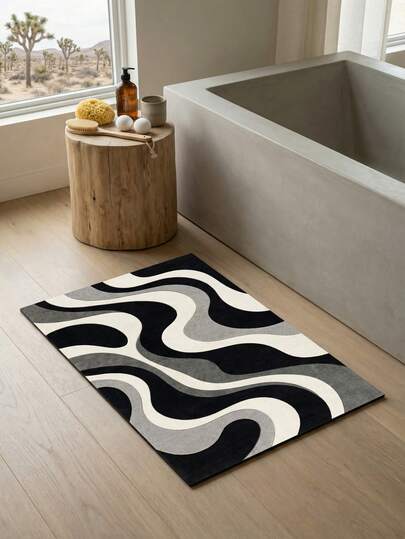 1 件黑色波浪纹浴室地垫,清新春夏设计,橡胶防滑底,吸水防滑,家居装饰,厨房地毯,适用于浴室、厨房和门口。
