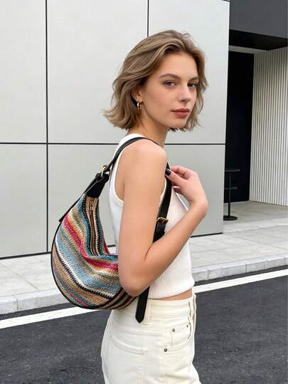 1个波西米亚风彩虹条纹编织新月包,轻便单肩包,配有可调节PU皮肩带,女士夏季沙滩休闲斜挎包