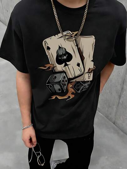 男童休闲扑克骰子英文字母印花圆领短袖T恤,夏季学生青少年服装 - 黑色 - 查看 1