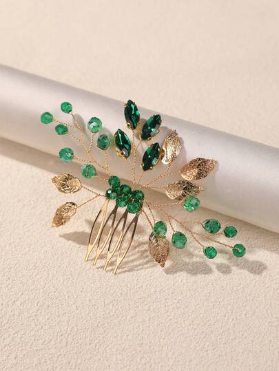 1件新娘发饰,祖母绿水晶金叶侧梳,高端优雅婚礼发饰 - 綠色 - 查看 1