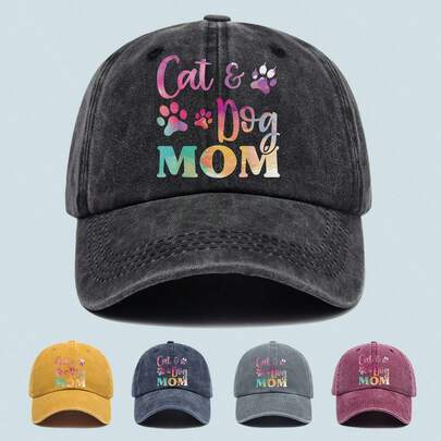 1顶“猫狗妈妈”水彩印花棒球帽,彩色渐变字母和可爱爪印图案,时尚男女通用可调节遮阳帽,宠物爱好者日常外出、聚会、野餐必备,舒适百搭