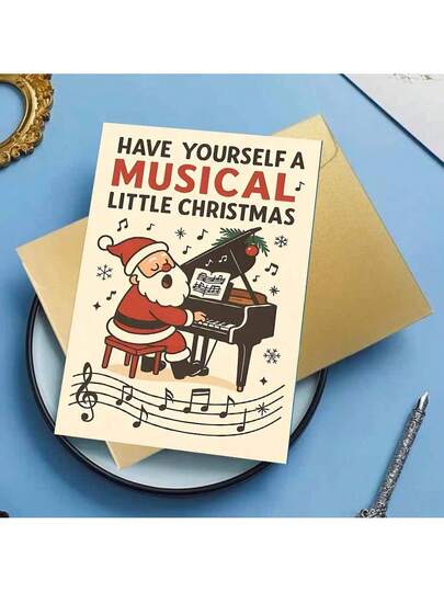 1 张圣诞音乐贺卡,圣诞老人弹钢琴 - 节日礼物,适合音乐爱好者,圣诞节,红白设计,包括红色信封和“圣诞快乐”信息,非常适合节日庆祝,圣诞贺卡 | 音乐主题 | 详细插图,圣诞贺卡 - 彩色 - 查看 1