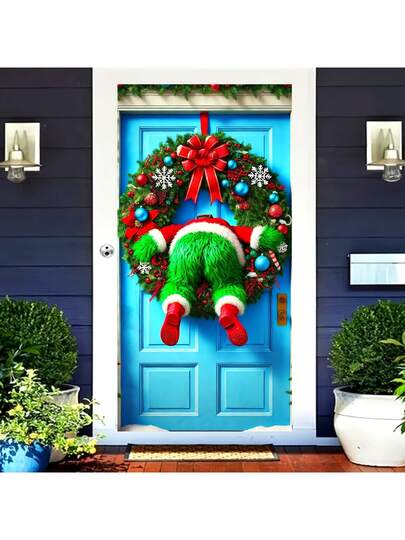 1 件,圣诞花环门罩,35.4 * 70.8 英寸,节日设计,绿色毛茸茸的人物卡在花环中,非常适合入口、房间、多用途悬挂装饰 - 彩色 - 查看 5