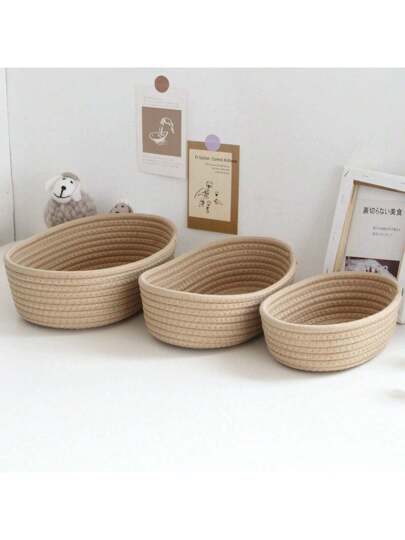 1 件棉绳编织椭圆形储物篮,简约北欧风格零食、装饰、床边、桌面收纳盒,适用于玩具、化妆品 - 卡其色 - 查看 1