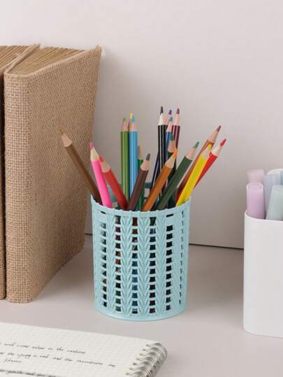 1個創意仿藤編織塑料筆筒,多功能極簡中空桌面組織者辦公用文具筆筒 - 藍色 - 查看 1