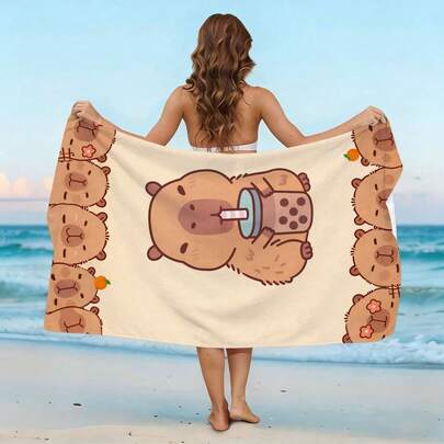 1条可爱水豚沙滩巾 - 速干、吸水性强、柔软舒适、大尺寸,印有萌萌的奶茶水豚图案,是海滩、泳池派对、瑜伽和旅行的理想之选。