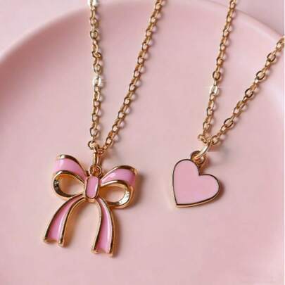 1件双层可爱甜美蝴蝶结爱心项链,粉色珐琅爱心吊坠锁骨链,适合日常佩戴,情人节礼物 - 粉色 - 查看 1