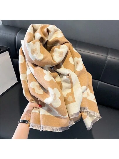 1 件女用圍巾/披肩,休閒雙面雙色花朵圖案設計,韓國溫暖柔軟仿羊絨,超長秋冬 - 杏色 - 查看 1