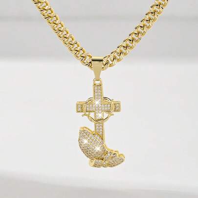 1件欧美经典铜镶嵌锆石嘻哈风格耶稣十字架吊坠项链,限量版“守护之光”,适合作为圣诞节/感恩节/万圣节/母亲节/情人节礼物送给情侣/朋友/信徒,天主教初领圣体礼物,日常及节日祈祷佩戴。 - 金黃色 - 查看 5