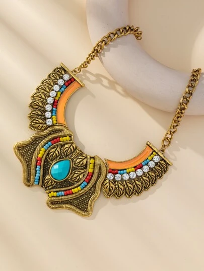 1 件歐美風格時尚復古女式誇張幾何蝴蝶葉形寶石鑲嵌短項鍊創意設計易於搭配埃及鎖骨鏈 - 彩色 - 查看 1