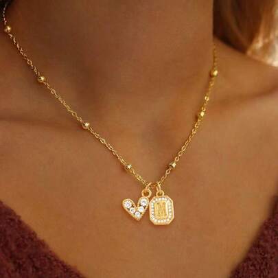 1件装时尚经典心形字母吊坠金色不锈钢珠链项链,女士款 - 金黃色 - 查看 1
