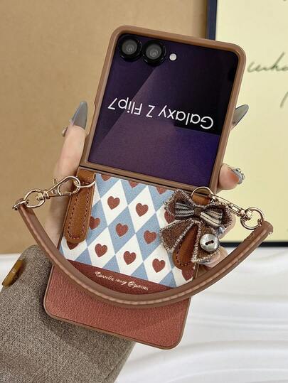 1个时尚简约的棕色心形网格元素皮革折叠手机壳,搭配蝴蝶结挂绳,可保护手机并防止跌落:适用于三星 Galaxy Zflip 3/Zflip 4/Zflip 5/Zflip 6/Zflip 7/ Razr 50 Ultra/ Razr 60 Ultra/ Razr 60/ Razr 50/Galaxy Z Flip7 FE - 棕色 - 查看 1