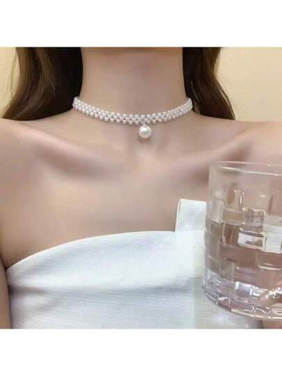 1 件时尚女士珍珠项链,精致颈链设计,质感高级,短锁骨链 - 白色 - 查看 1