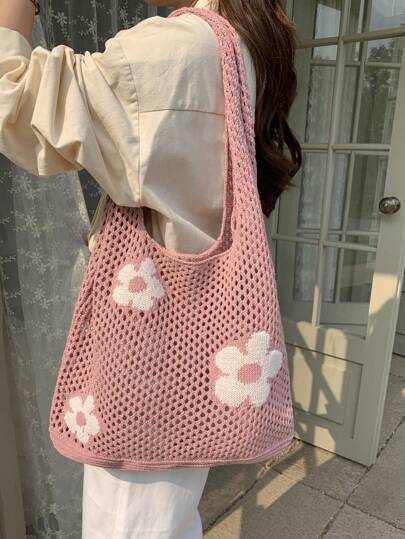 1個花紋針織手提包,大容量中空手提袋,時尚沙灘包和上班通勤袋 - 粉色 - 查看 1