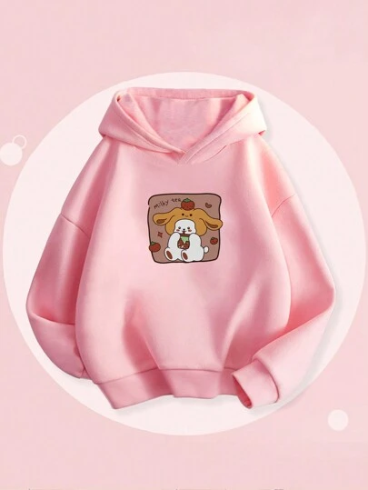 少女卡通图案印花卫衣,加厚带帽设计,适合年轻学生,秋冬季穿着 - 粉色 - 查看 1