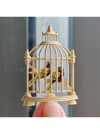 1入簡約復古鍍金鳥籠造型胸針,油滴動物設計適合女性節日穿著 - 金色 - 查看 1