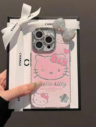Sanrio 1个渐变电镀亮片卡通三丽鸥Hello Kitty猫咪水钻蝴蝶结TPU防震手机壳,适用于 11/12/13/14/15/16/17/Pro Max - 粉色 - 查看 3