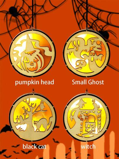 1 件万圣节圆形木质装饰灯,空心 LED 氛围灯(不含电池),万圣节装饰品,黑猫,南瓜,小鬼元素装饰品,窗户墙壁装饰
