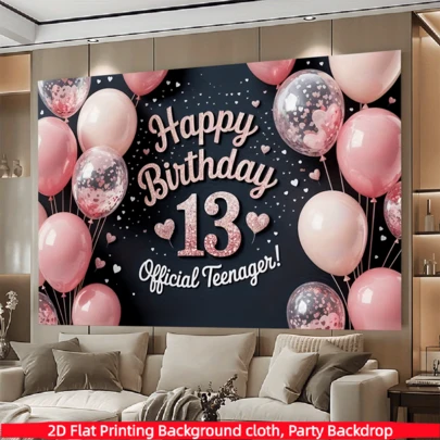 1件装,13岁生日快乐横幅 - 涤纶材质,闪亮粉色金属气球和心形图案涤纶派对背景装饰,拍照道具,房间装饰 - 正式青少年庆祝用品,生日派对装饰,节日主题,生日派对装饰 | 闪亮粉色气球,生日派对装饰用品 - 彩色 - 查看 1