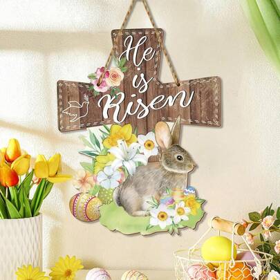 1件装“他已复活”门牌,复活节十字架门牌,宗教基督教木质悬挂花卉兔子彩蛋装饰,适用于家居门廊墙壁装饰,复活节礼物 - 多色 - 查看 1