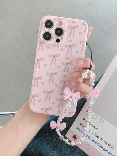 1个心形粉色蝴蝶结设计手机壳,配有串珠挂绳,可爱防震保护套,兼容 17/17 Air/17 Pro/17 Pro Max/16/16 Pro/16 Plus/16 Pro Max 16 11 12 13 14 15 Plus Pro Max/16/16 Pro/16E - 粉色 - 查看 1