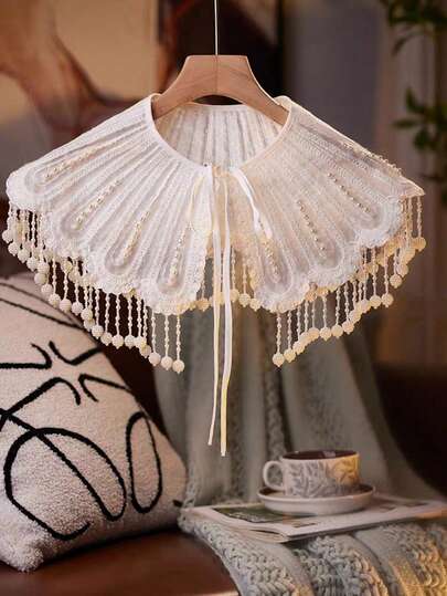 一件重工刺绣、串珠和流苏装饰披肩领,亮面面料,时尚女式配饰,适合婚礼和节日场合。 - 白色 - 查看 1