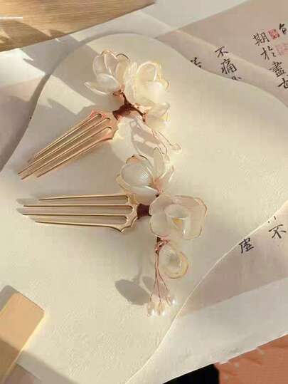 1个高档仿贝壳花发夹,手工精制U型花朵发夹,中国风女孩日常发饰,新娘伴娘头饰,百搭办公发饰 - 彩色 - 查看 2