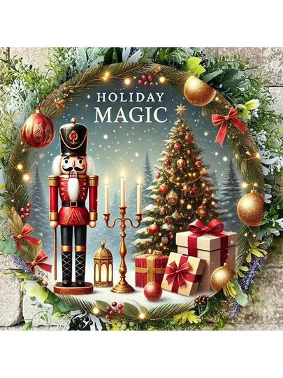 1pc Holiday Magic Round Metal Tin Sign, 3D Walnut Clip Mural, Foil Engraving Home Decoration, Multifunctional Holiday Wall Ornament, Iron, English Text, Wall Hanging, Diameter 12inch - 彩色 - 查看 1
